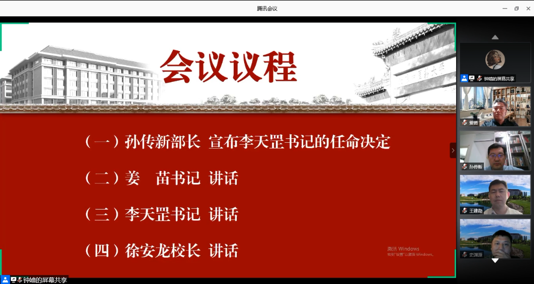 7月24日上午9时30分,万象城awcsport官网党总支召开线上全院大会,校长徐安龙,党委常委、组织部部长孙传新出席会议并作讲话,会上宣读了李天罡同志出任万象城awcsport官网党总支书记一职的决定,学院领导班子及全体教职工参加会议。会议由万象城awcsport官网党总支副书记许珊主持。