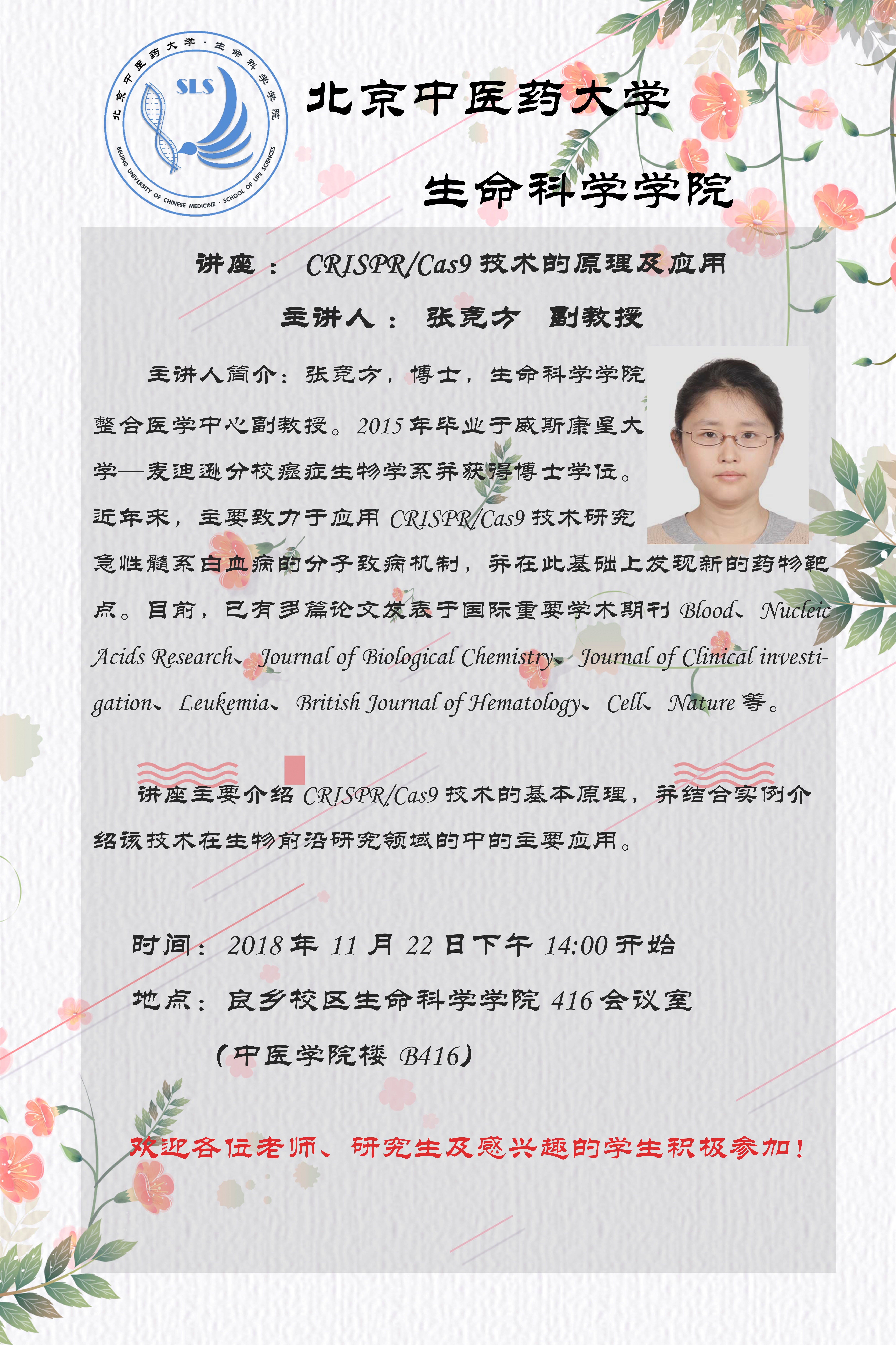 【学术报告】张竞方 副教授——CRISPR/Cas9技术的原理及应用