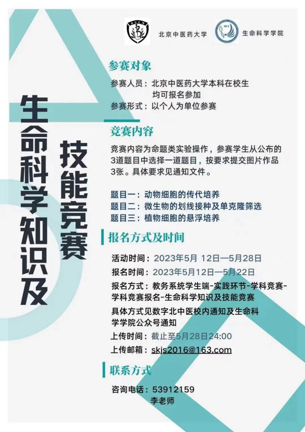 通过组织生命科学知识及技能竞赛,扎实学生学科知识和实验技能,为培养一批具有生物学知识,具备中医药学知识背景,熟练掌握现代生物科学技术方法和实验技能的行业人才做好准备。