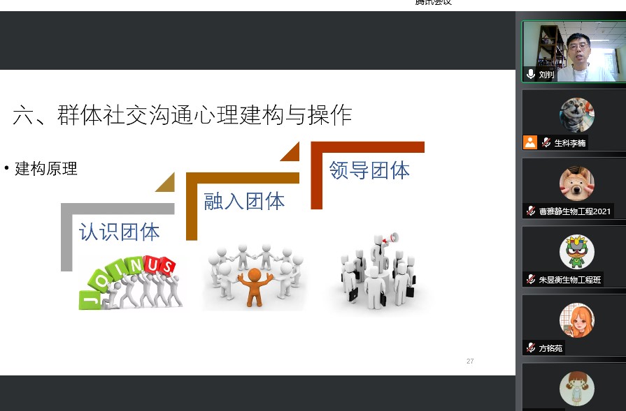 为了缓解疫情大环境下同学们种种生活、学习压力,满足同学们对心理相关知识的需求,提升同学与人沟通交流表达的能力,万象城awcsport官网于2022年6月23日举办了主题为“沟通的心理发生原理与心理操作方式”的线上心理讲座,讲座邀请到了校心理咨询中心刘钊老师为同学们讲解了有关人际交往及沟通交流方面的心理健康知识,学院本科生、硕士生、博士生均参与了这次活动。活动由学院辅导员李楠老师主持。