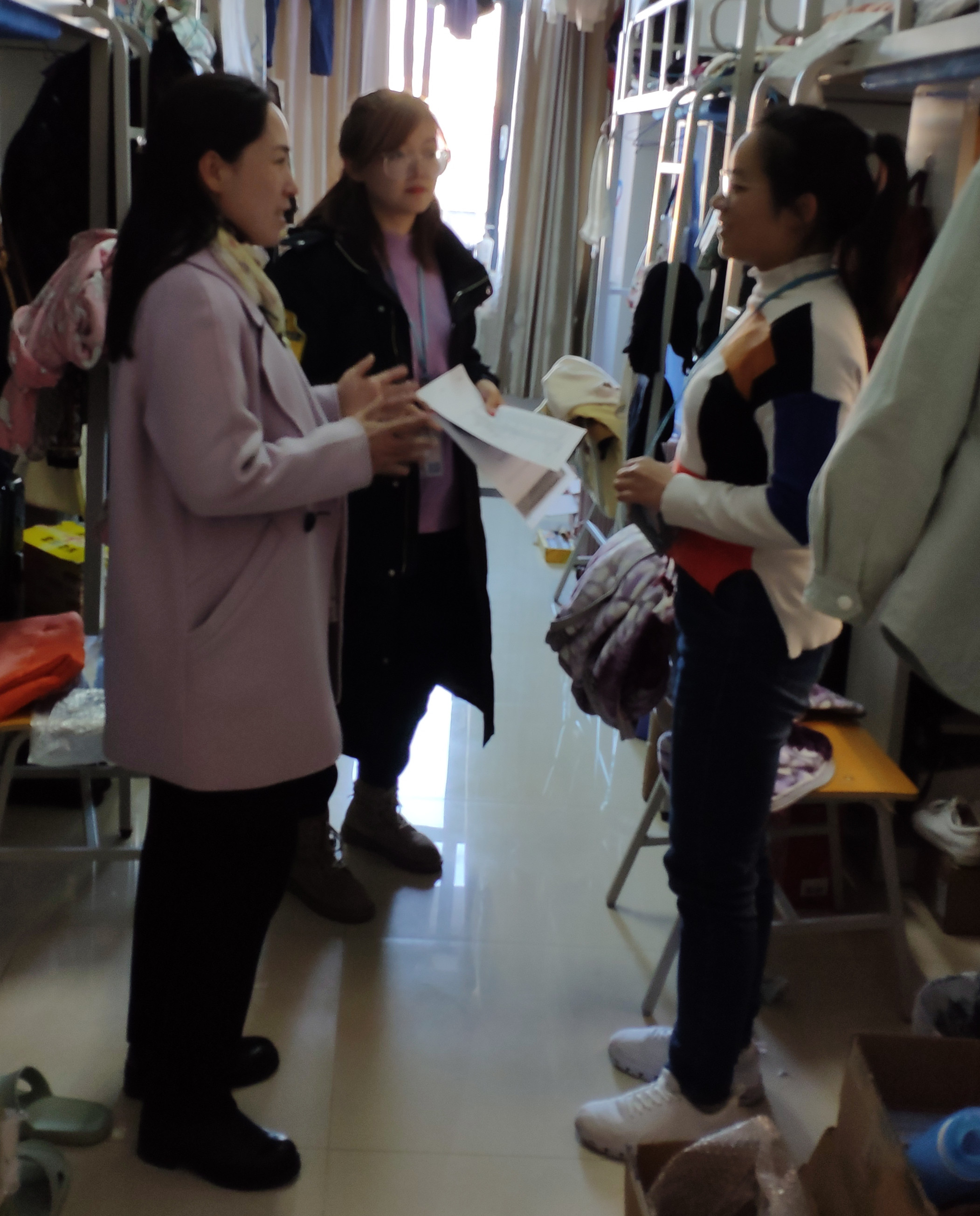 在深入宿舍过程中,许珊老师和同学们进行交流,了解大家的学习科研生活情况,同时以鲜活的案例强化同学们的安全意识,强调了出门即时关闭电源、严禁使用违规电器、严禁使用床帷等安全注意事项的细节,号召同学们共同创造安全、整洁、有序、文明的学习和生活环境。王利老师、李楠老师及学生干部,对寝室安全及卫生做了仔细检查和详细记录,在检查的过程中对发现的问题进行及时提醒,督促整改。