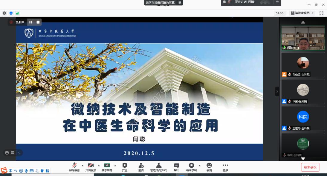 本次活动邀请了王建勋院长做了主题为《肿瘤和免疫研究平台》的报告。同时,邀请闫聪老师做了《微纳技术及智能制造在中医生命科学的应用》的报告,王旭老师做了《中医人工智能图像处理的初步探索》报告,甄建华老师做了《中医体质相关的肠道菌群结构与功能特征》报告,张越老师做了《中药来源纳米颗粒与生物屏障的相互作用》报告,朱莉莉做了《冥想对脑功能影响》报告。