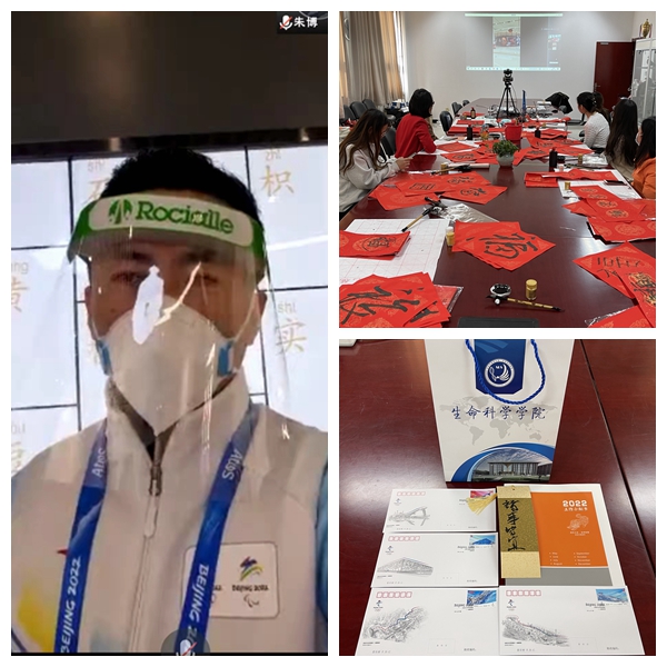 慰问活动从学院416会议室开始,学院为师生们准备了斗方与春联,院领导为同学们书写祝愿书签与福字。学院党委书记李天罡通过线上形式从冬奥村送来新春祝福,带领同学和老师们云参观 “10秒”中医药体验馆,并为同学们送来了冬奥首日封这份有着特殊意义的春节礼物。华茜院长为同学们准备了“时间管理小秘书”,嘱托同学们在新的一年里,合理规划时间,朝自己设定的目标努力。院领导们将亲笔书写的祝福书签与“小秘书”“首日封”一起放入生科新春盲盒中进行发放。