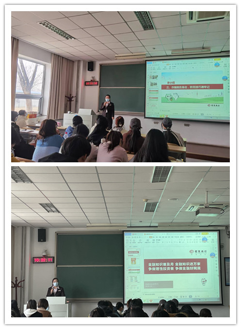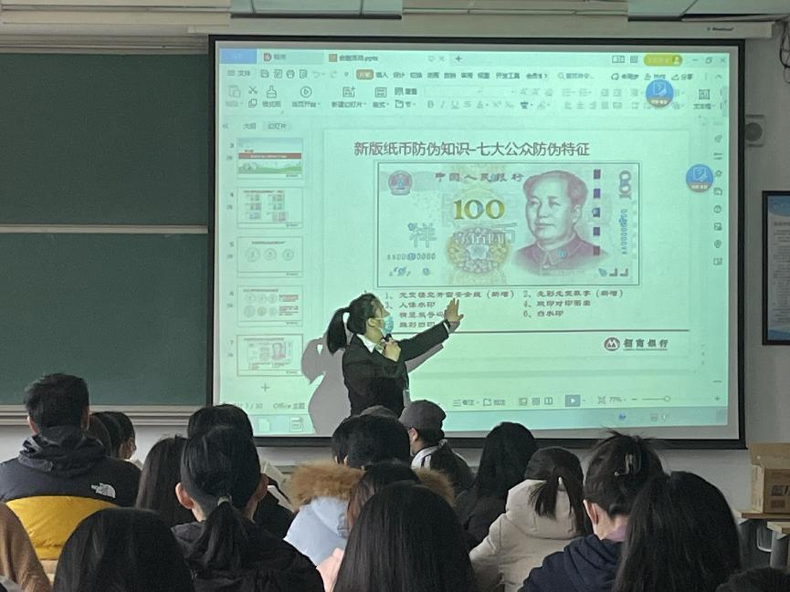 讲座的主要内容是人民币的防伪技巧以及预防电信网络诈骗的方法。首先,银行工作人员肖攀介绍了新版第五套人民币的“一转二摸三透光”的防伪技巧以及新钞兑换、残损币兑换、硬币兑换等银行现金服务功能,科普了一些基本的金融知识。肖攀结合真实发生的电信网络诈骗案例进行深入浅出的讲解,并介绍了常见的诈骗手段,例如:下载APP,绑定社交账号;冒充企事业单位、节目组、国家相关工作人员;虚构情形诈骗等,将“八个凡是,六个一律”的防诈小妙招、被骗后的应急措施讲解给同学们。