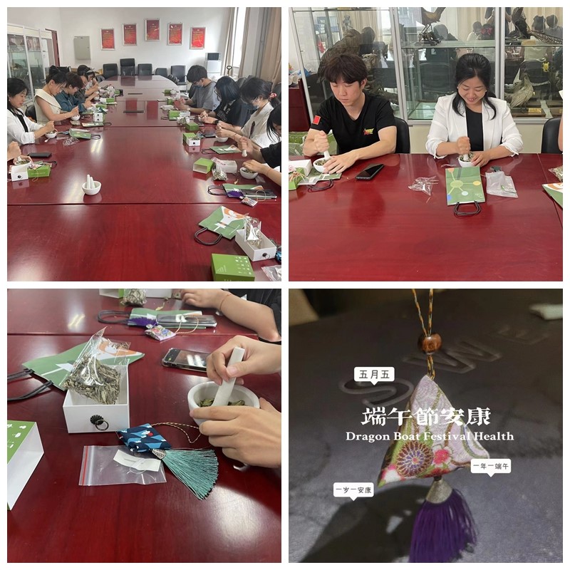 为传承中华优秀传统文化,展示传统文化魅力,体验传统节日中蕴含的历史意义,两院师生在开展了主题学习的同时,还开展了“品味端午,传承文化”香囊制作活动。生科院陈欢同学向北京工商大学传媒与设计学院的师生们讲述了香囊文化的发展,香囊中中药的配方成分与功效,同时介绍了香囊的制作方法。在实践环节,听完讲解的师生们对中医药文化及香囊文化产生了浓厚的兴,纷纷参与其中,从研磨到装包再到缝制,一步一步亲手完成。过程中,大家反复观看视频讲解,相互交流学习,活动氛围热烈,师生共同沉浸在艾叶和冰片等草药的香气中,亲身体验制作的过程,感悟端午传统文化情结,学习中医药文化,增强文化自信。